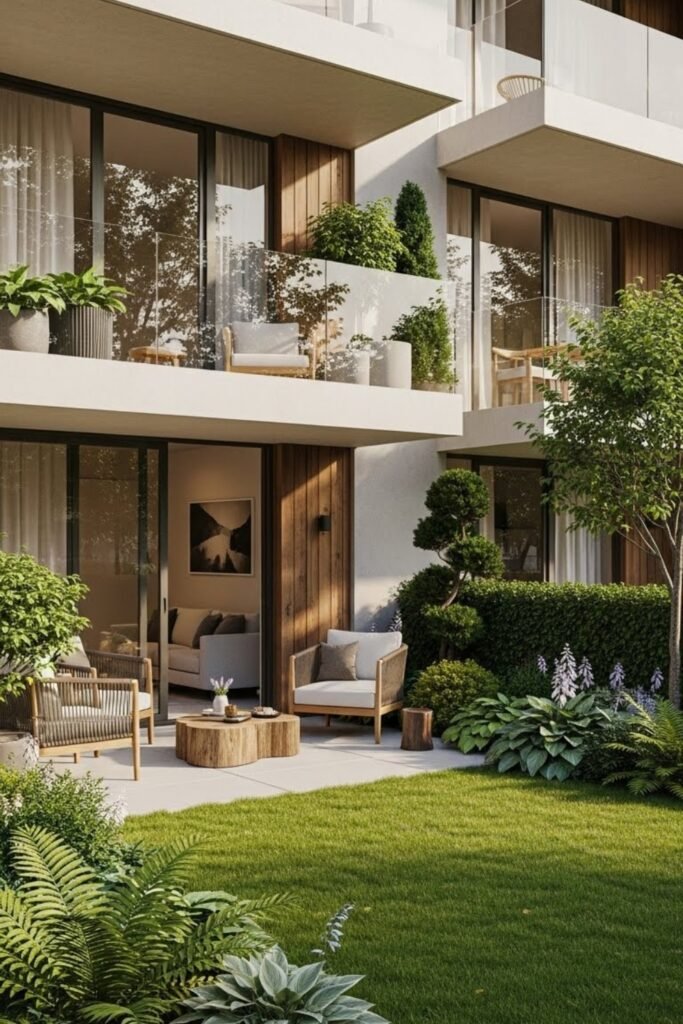 Living areas are oriented toward private gardens or patios rather than the street. This design improves indoor-outdoor connection and creates a calm living environment.