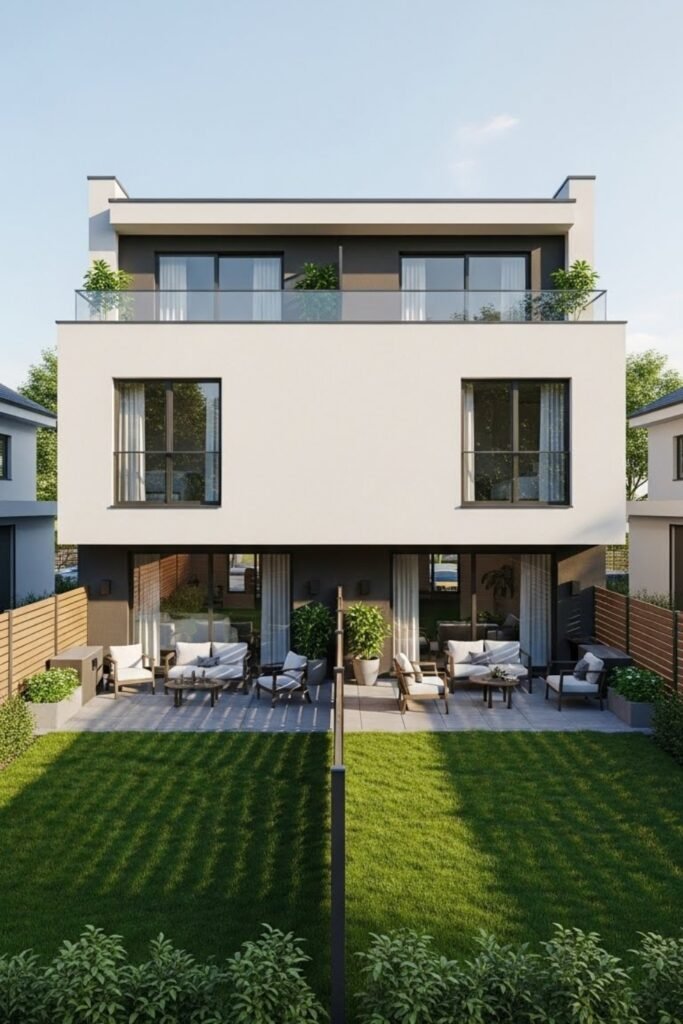 This duplex plan adds usable outdoor space by placing a terrace on the roof. Each unit can have a private section or a shared area, depending on preference.