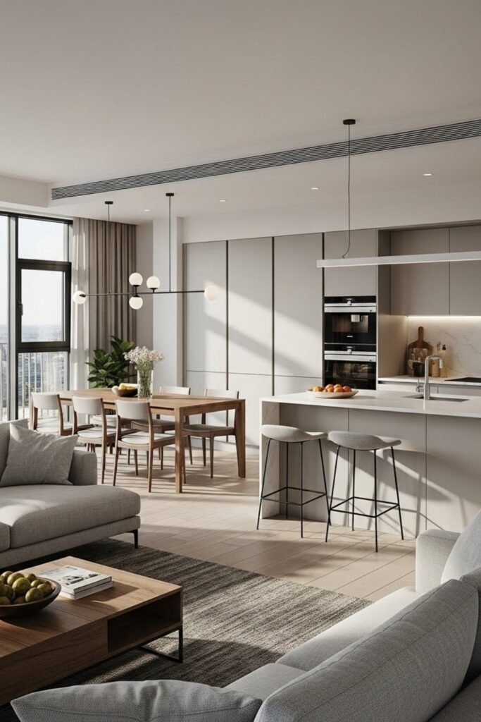 Each unit features an open living, dining, and kitchen layout with fewer internal walls. This plan makes the space feel larger and more modern.