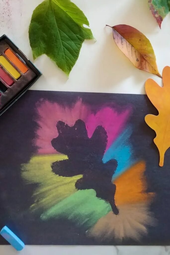 This leaf shadow art gives fall crafts a beautiful, dreamy twist. Put a leaf cutout on black paper and then use chalk pastels to blend around it to get a glowing silhouette.
