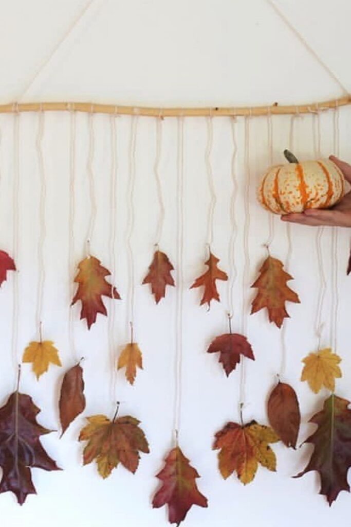 This wall art with hanging leaves makes basic things you see in nature look fancy. Gather up leaves of all hues and sizes in the fall, flatten them down, and tie each one to a thread that is dangling from a wooden pole.