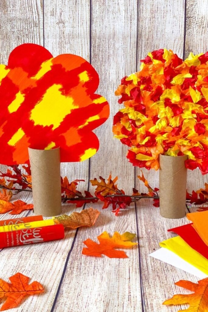 Use cardboard rolls for trunks and cardstock tree tops to make the trees. To make it seem like fall leaves, glue crumpled pieces of orange, yellow, and red tissue paper together.