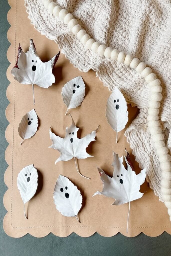 These ghosts made of leaves are a fun and spooky take on fall crafts. Just paint dried leaves white, let them dry, and then use a marker or paint to add small black eyes and mouths.