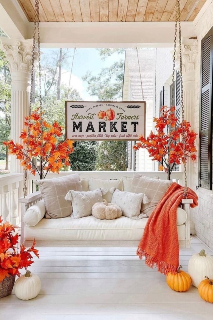 To frame a swing or seating area, put fake maple branches in baskets and planters. Then, to offset the hue, use neutral pillows and thick throws.