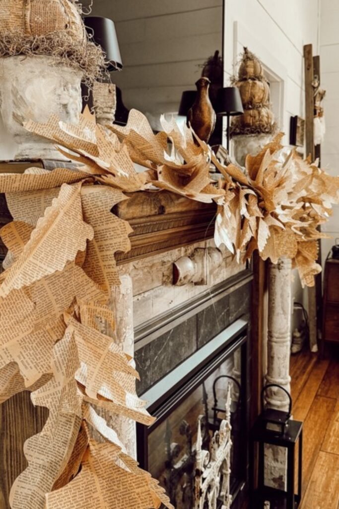 This book page leaf garland gives any fall mantel a touch of old-world elegance. Cut out leaf shapes from old book pages, bend the edges a little, and tie them together using jute twine.