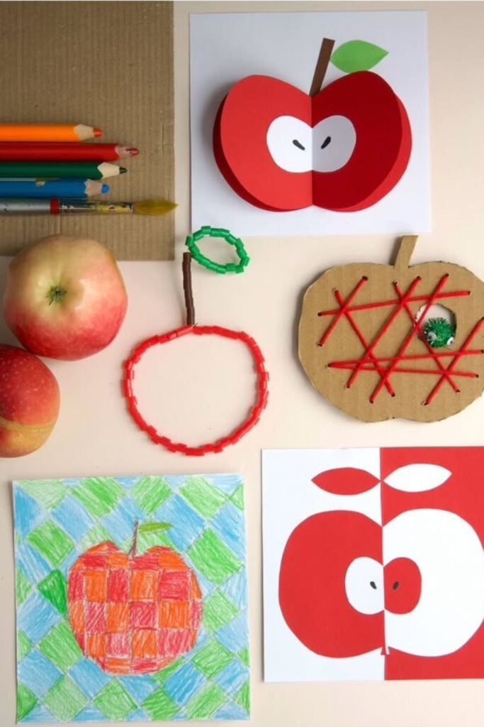 For cards, try a 3D paper apple; for motor skills, try a yarn-laced cardboard apple; and for art exhibition, try a crayon weave apple.