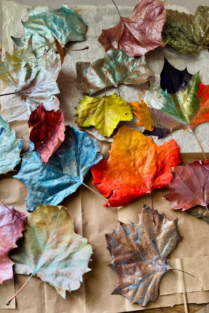 Just gather dry leaves, paint them with metallic acrylics or spray paint, and let them dry on parchment.