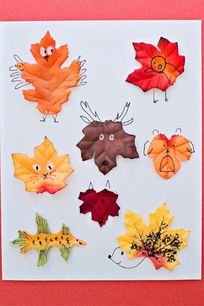You may make anything from foxes to fish by gluing colored leaves to paper and then drawing little details like eyes, legs, wings, or tails.