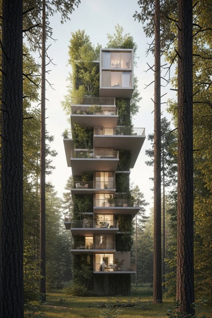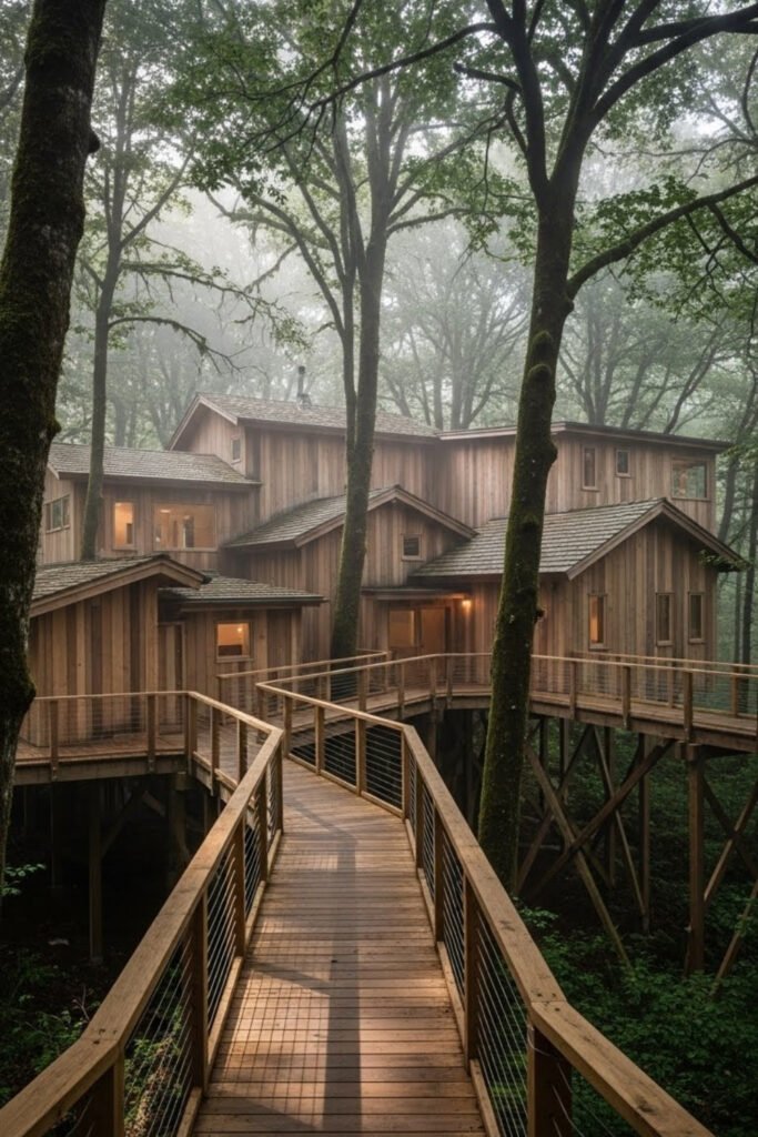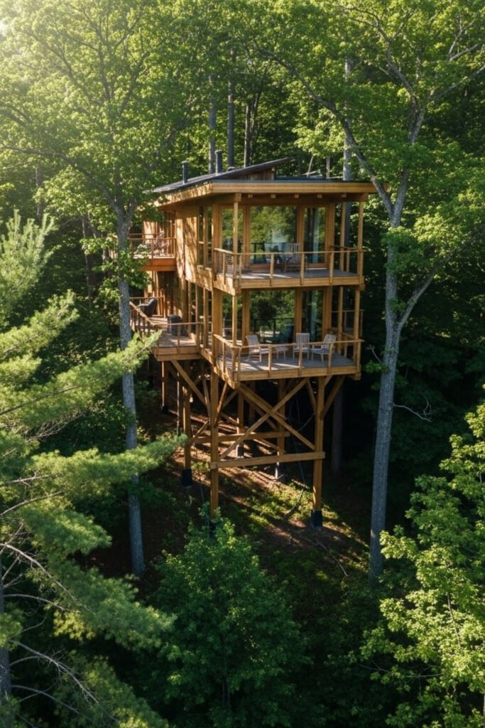 The design maximizes views, airflow, and natural light while keeping the forest intact. It’s ideal for dense woods where ground space is limited but vertical space is abundant.