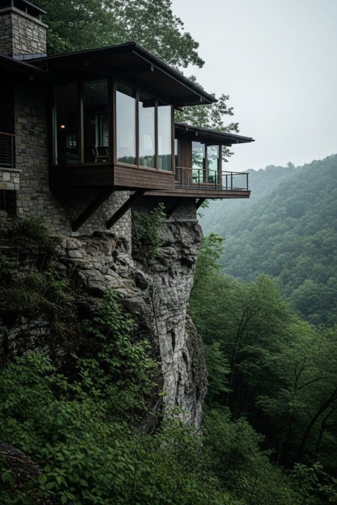 Positioned along a forest slope or rocky edge, this house takes advantage of dramatic elevation. Large windows face outward while the rear stays anchored into stone.