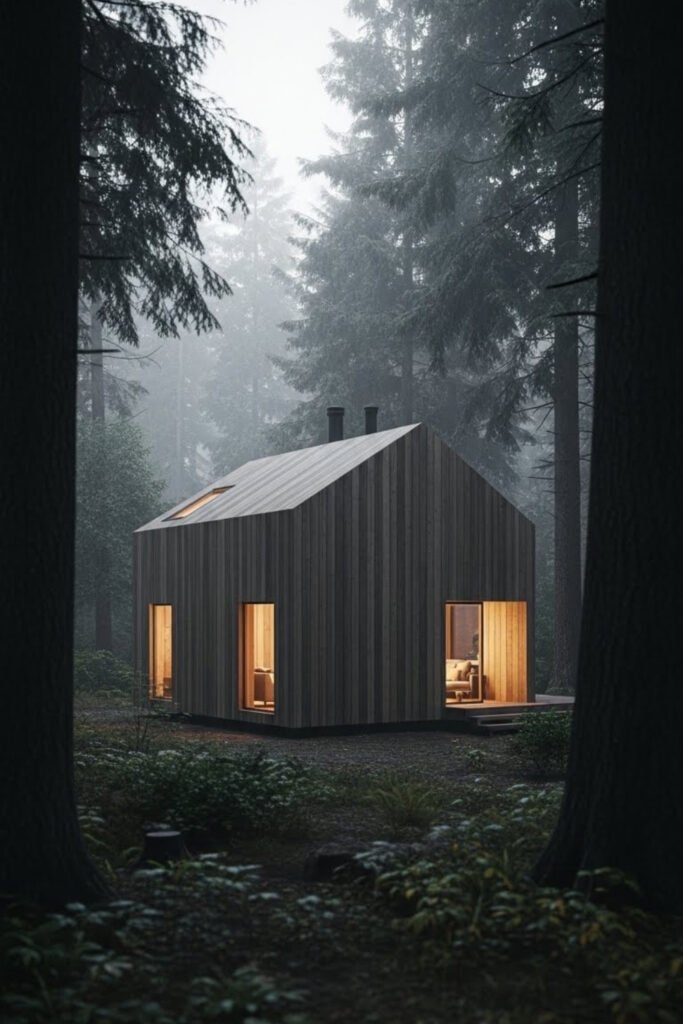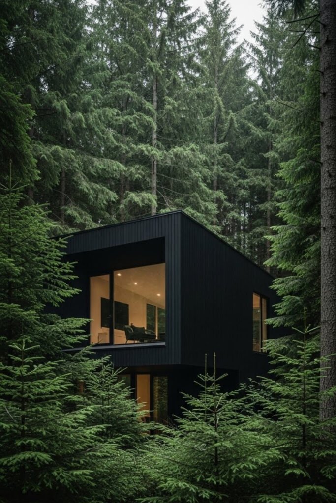Inside, warm wood balances the exterior’s boldness. This design works well in dense forests where light shifts constantly, creating a striking contrast between shadowed trees and clean architecture.