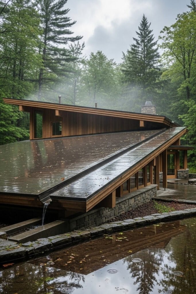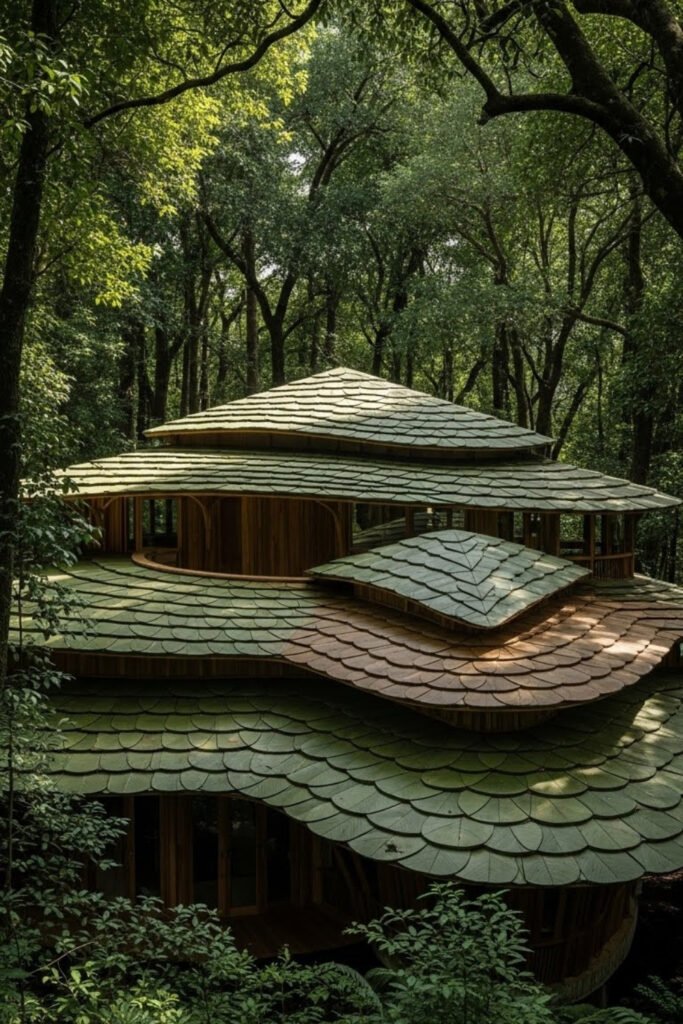 This house uses layered, leaf-inspired roofing that channels rain naturally while blending into the forest canopy. The overlapping design reduces noise from rainfall and improves insulation.