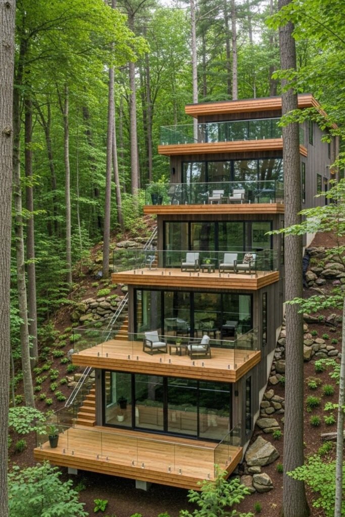 Rather than spreading outward, this home rises upward. Multiple levels stack efficiently, reducing ground disturbance. Balconies and terraces face different forest views at each height.