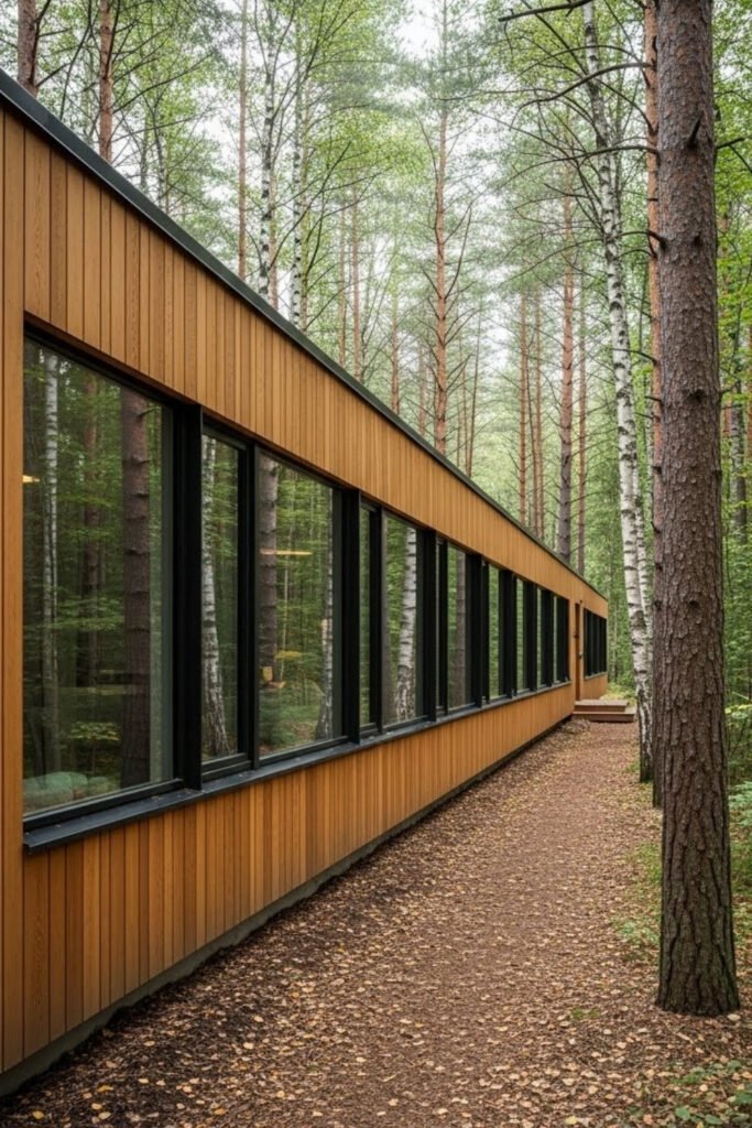 This idea fits tight forest corridors and creates a calm, linear living experience that feels grounded and intentional.