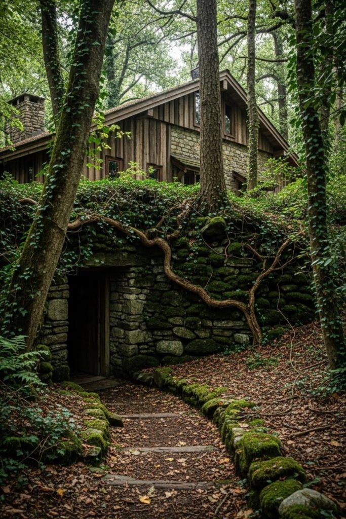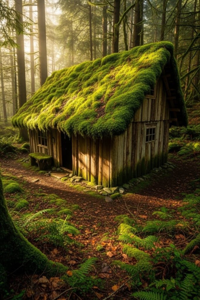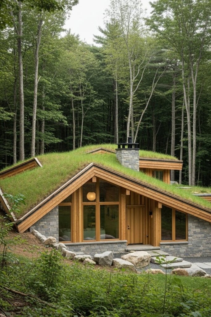 At first glance, this house almost disappears into the forest. A moss-covered roof helps the structure blend naturally with its surroundings while adding insulation and moisture control. This idea works best in damp woodland areas where moss grows easily.