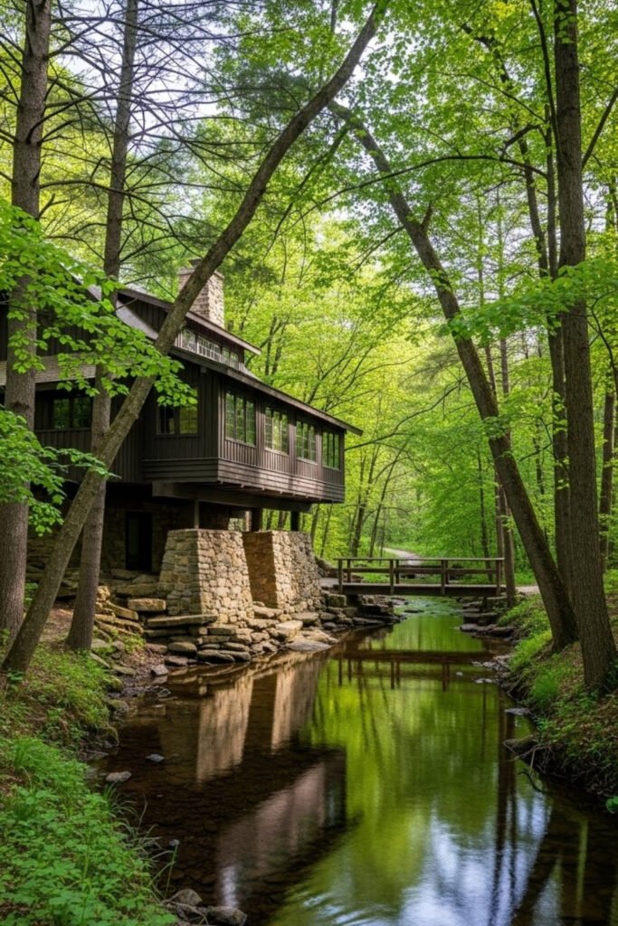 Windows and decks face the water while keeping the structure protected. It’s ideal for wooded land with natural streams, offering calm views and constant connection to movement and sound.