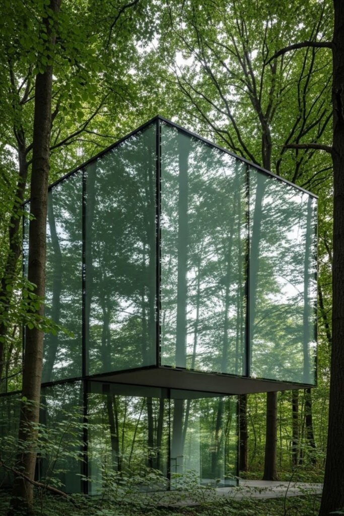 This design turns the forest into the home’s main feature. A clean glass cube structure allows uninterrupted views of trees from every angle. The exterior stays minimal so the forest dominates visually.