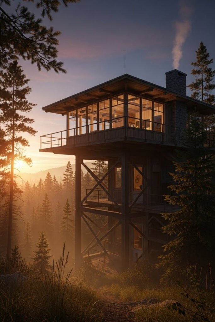 This design draws inspiration from classic forest fire lookout towers. Elevated living spaces provide wide views above the tree line while keeping a small footprint below. Large windows wrap the upper level, creating a sense of watchfulness and calm.