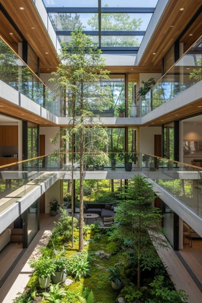 Nature enters the center of the home. An open atrium filled with trees or plants brings daylight deep inside while improving airflow.