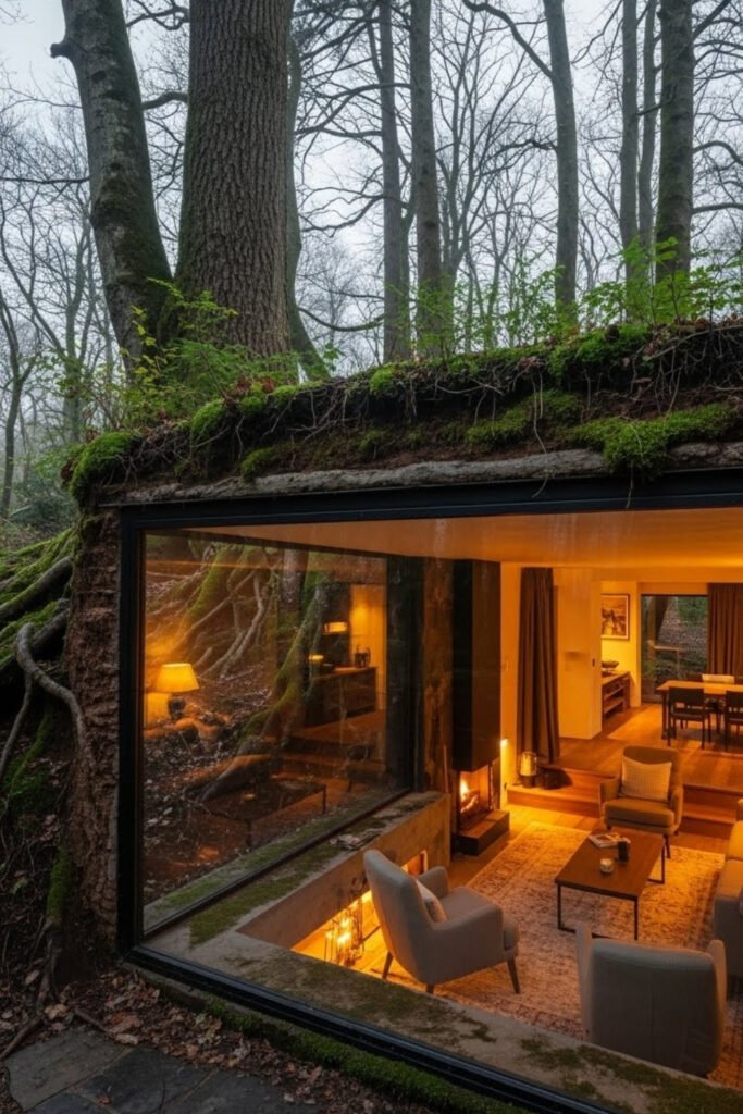 Only the front façade stays visible, often with wood and glass. This idea works best on sloped forest land and creates a quiet, protected living space that feels grounded and secure.