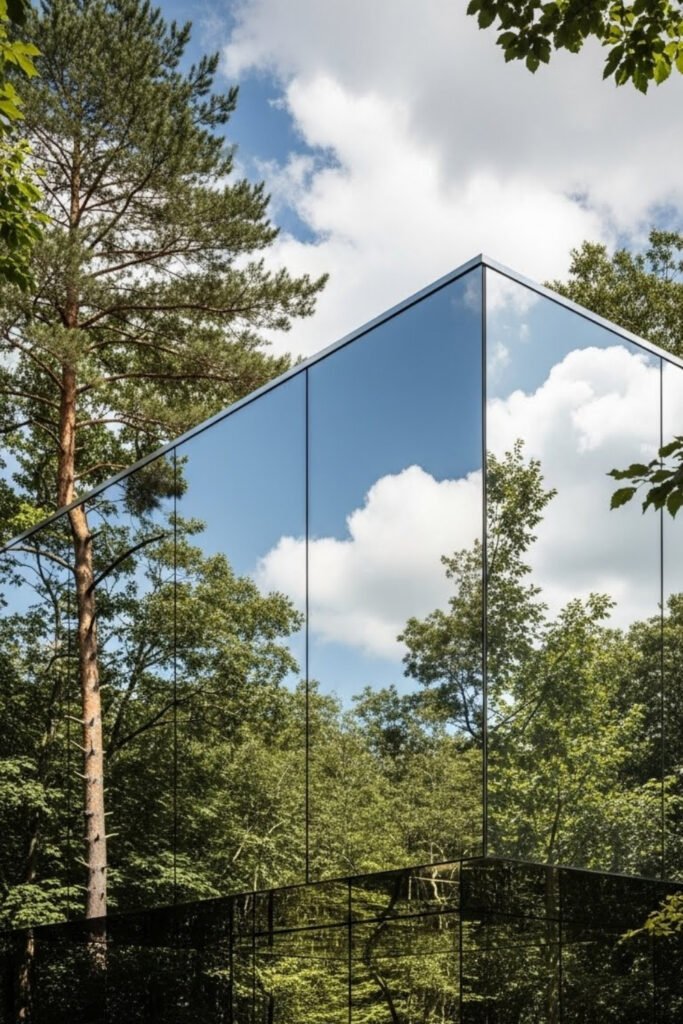 Reflection becomes camouflage. Mirrored exterior panels reflect surrounding trees, sky, and ground, making the house visually disappear from certain angles.