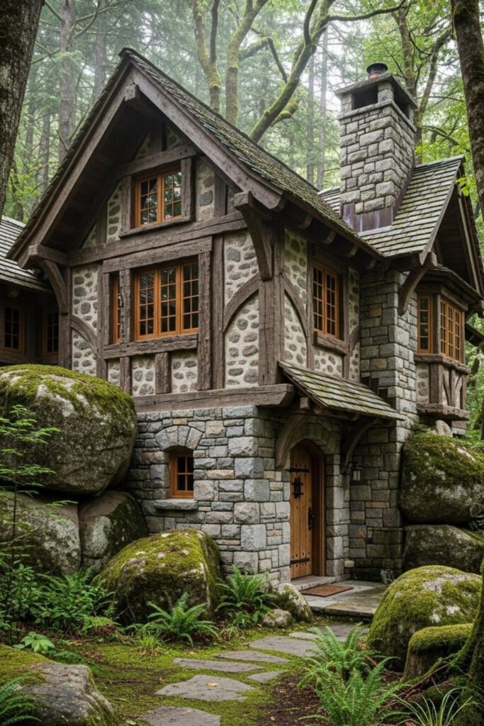 Paired with wooden beams and small openings, the house feels solid and protected. It’s ideal for forest areas with rocky terrain or natural stone access.