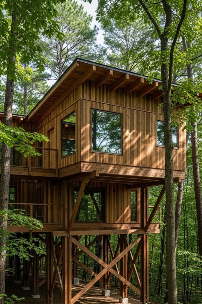 This idea works well on small forest plots where space is tight but height is available, creating a layered living experience among the trees.