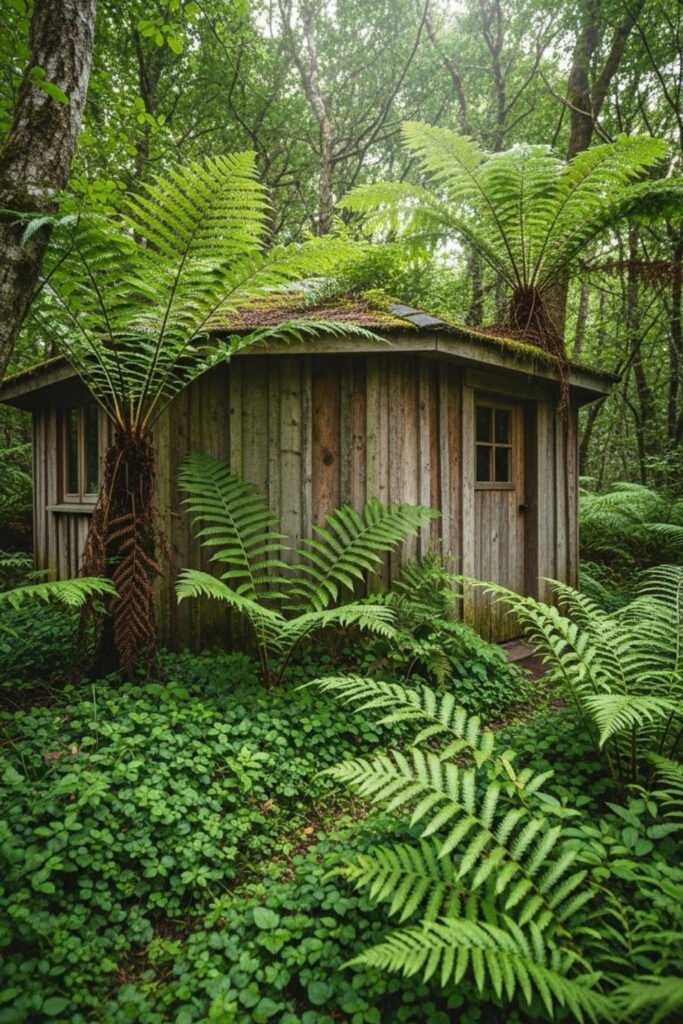 Soft edges define this forest home. Surrounded by ferns and low vegetation, the cottage uses rounded forms, natural wood, and muted colors to blend quietly into its setting.