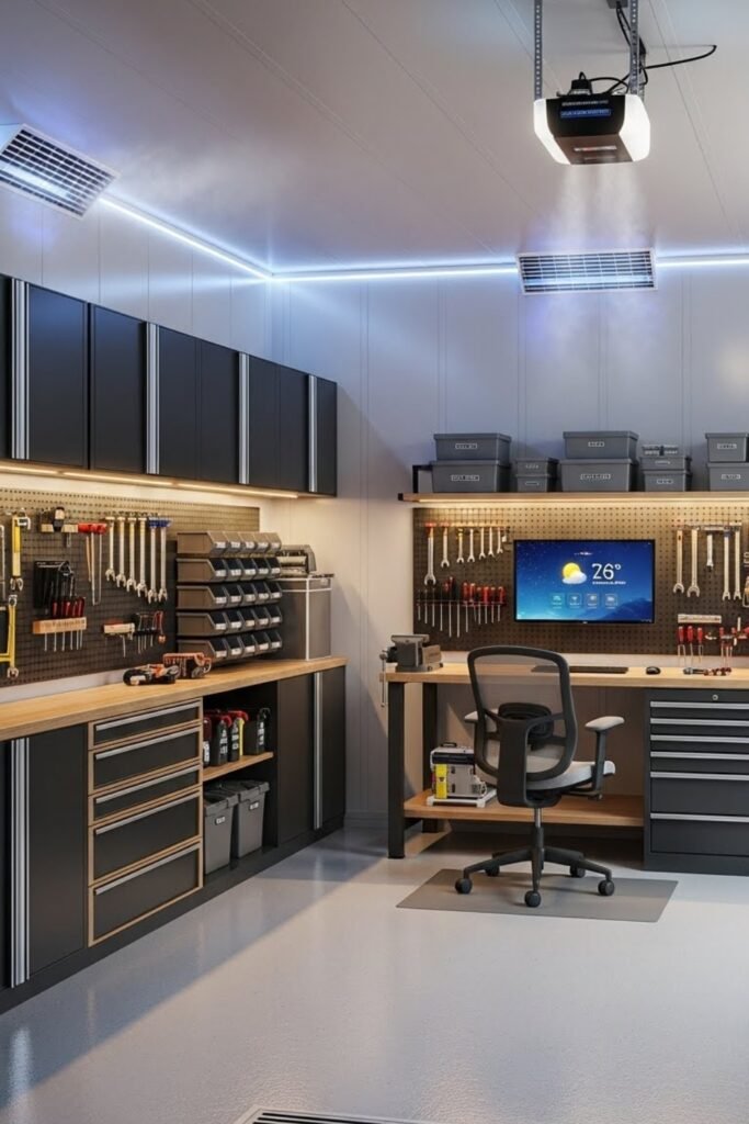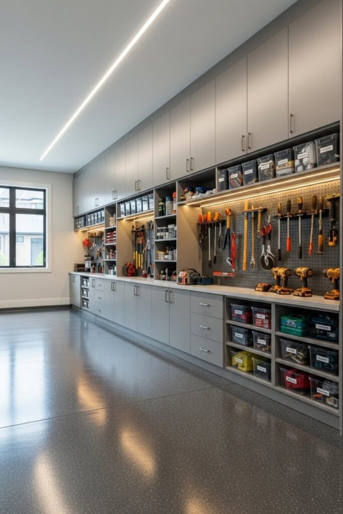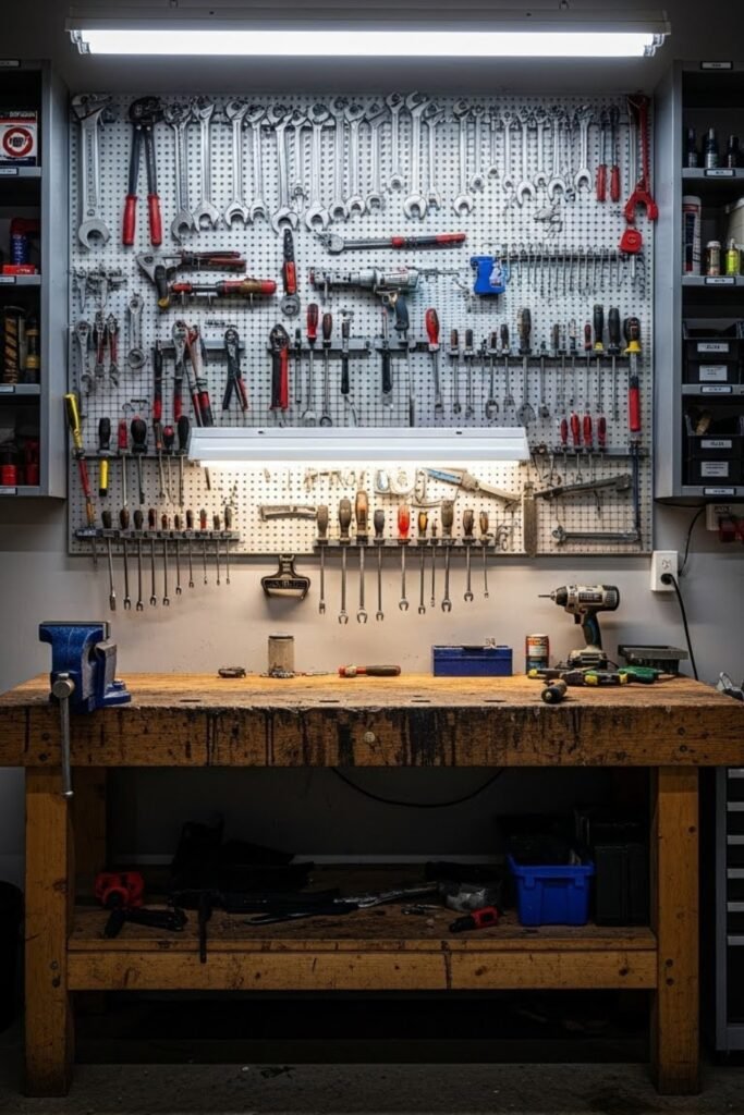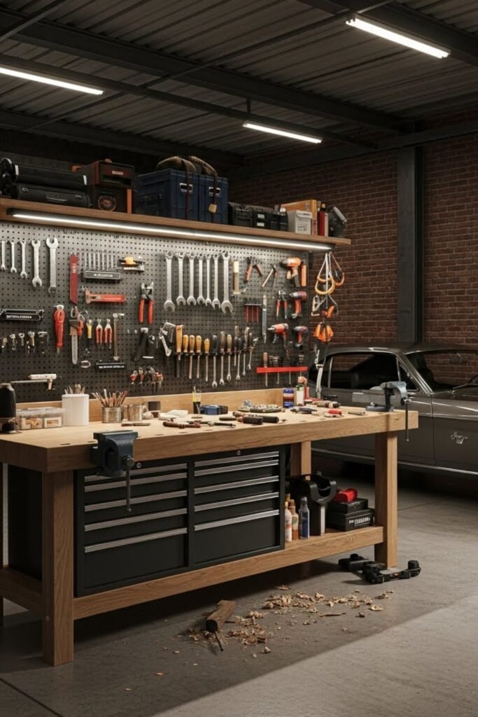 A tool-centric garage is built around easy access and visibility. Walls feature pegboards, magnetic strips, and modular panels so tools stay organized and within reach.