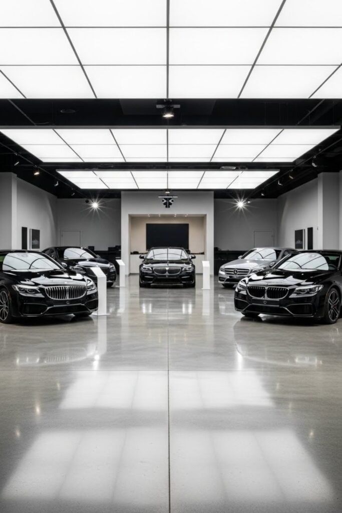 A car display garage is designed to showcase vehicles rather than hide them. Symmetrical layouts, bright lighting, clean floors, and minimal storage keep attention on the cars.