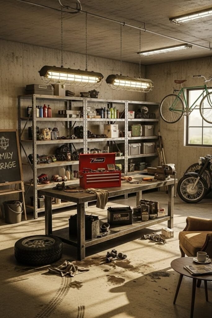 This garage design puts the workspace first, with a large central workbench, dedicated tool walls, and strong task lighting. Vehicle parking is secondary,