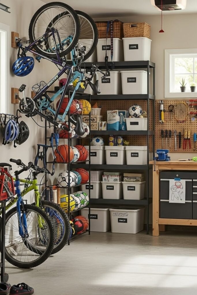 A family garage is designed around everyday household needs. It includes bike racks, sports equipment storage, labeled bins, and easy-access shelving.