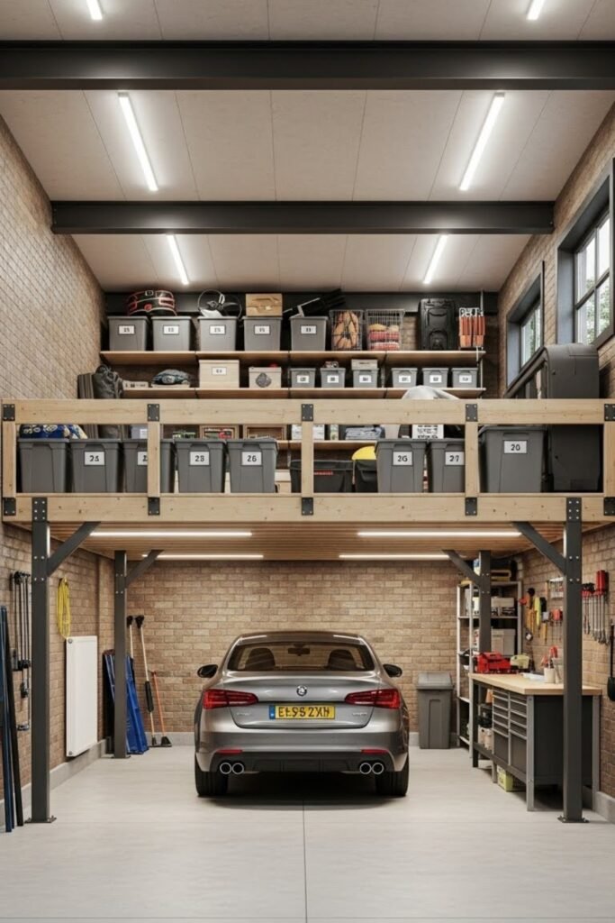 This design adds an overhead loft or raised platform above the garage floor for seasonal or long-term storage. It keeps bulky items off the ground without reducing parking space.