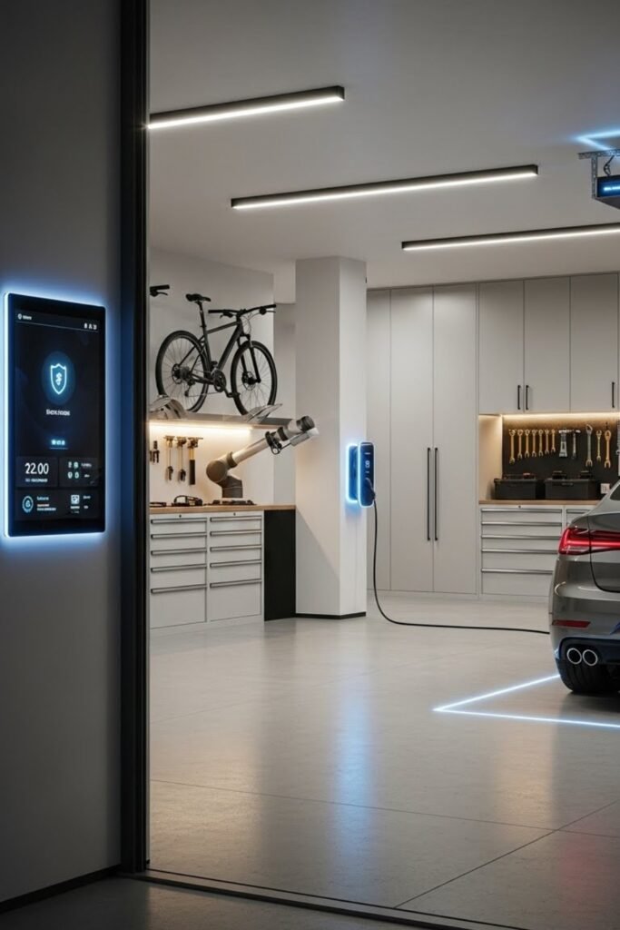 A smart garage integrates technology for convenience and security. Features may include automated doors, motion-sensor lighting, smart locks, and app-controlled systems.