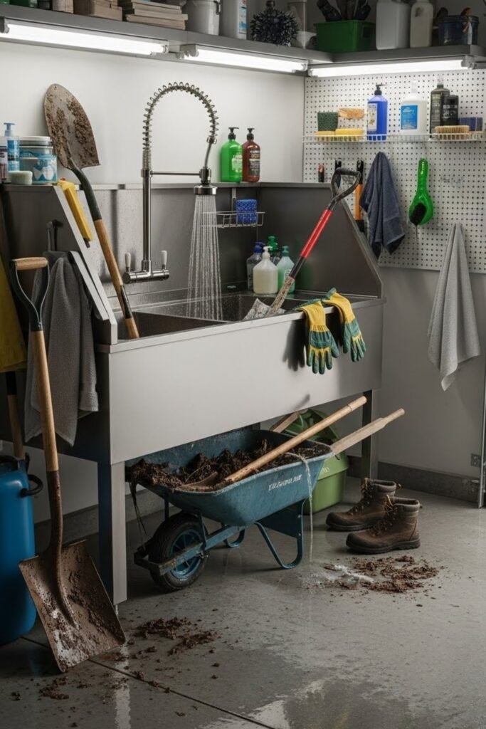 It helps keep messes out of the house and makes cleanup quick after projects or outdoor activities. Storage for cleaning supplies is usually placed nearby for convenience.