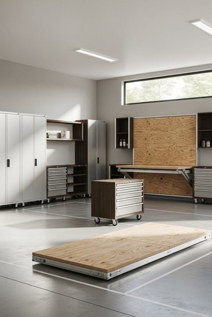 A flexible garage layout allows the space to change based on need. Movable storage units, foldable