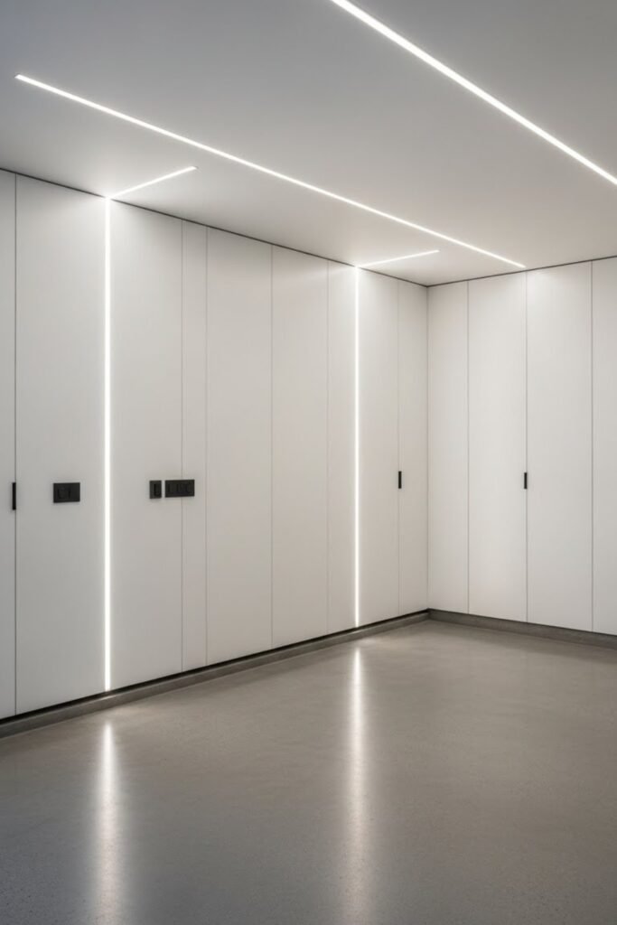 A minimalist garage uses clean lines, neutral colors, and hidden storage to create a calm, clutter-free space.