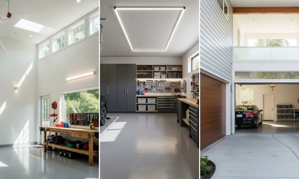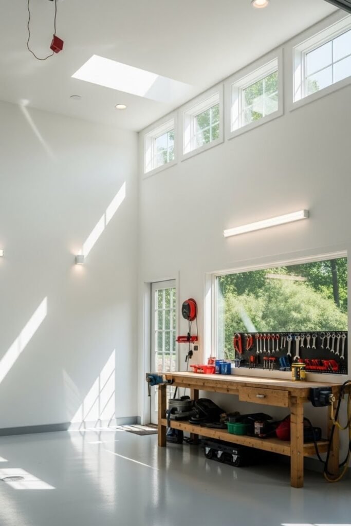 This design focuses on bringing natural light into the garage using skylights, clerestory windows, or frosted glass panels.