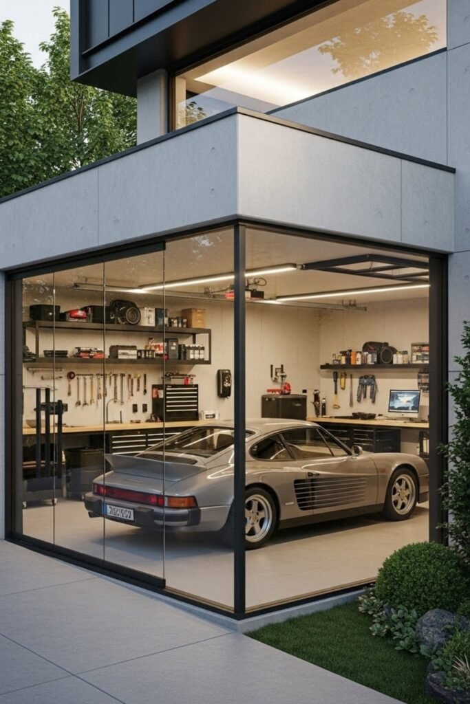 This design works well for collectors or anyone who wants their garage to feel like a private showroom.
