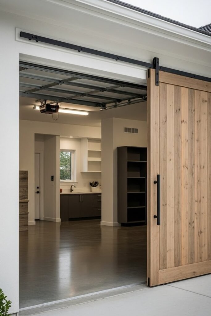This garage design replaces traditional overhead doors with sliding or barn-style doors.