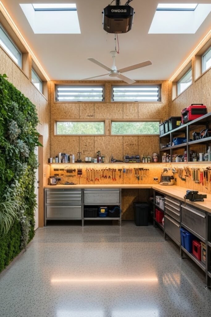 An eco-focused garage uses energy-efficient lighting, recycled materials, and low-impact finishes.