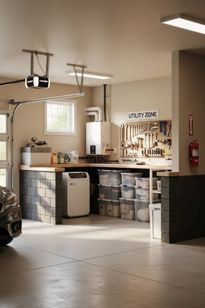 The zone is separated from parking and work areas to improve safety and organization. It keeps essential systems accessible while maintaining a clean, usable garage layout.
