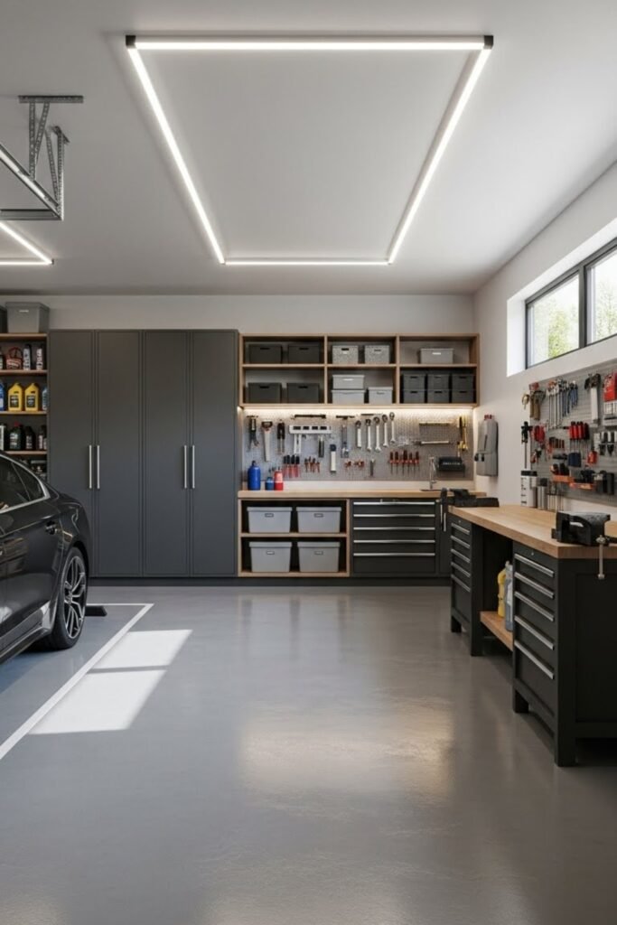 Floor markings, lighting placement, or wall systems help visually separate areas without adding walls, making the garage feel organized and efficient.