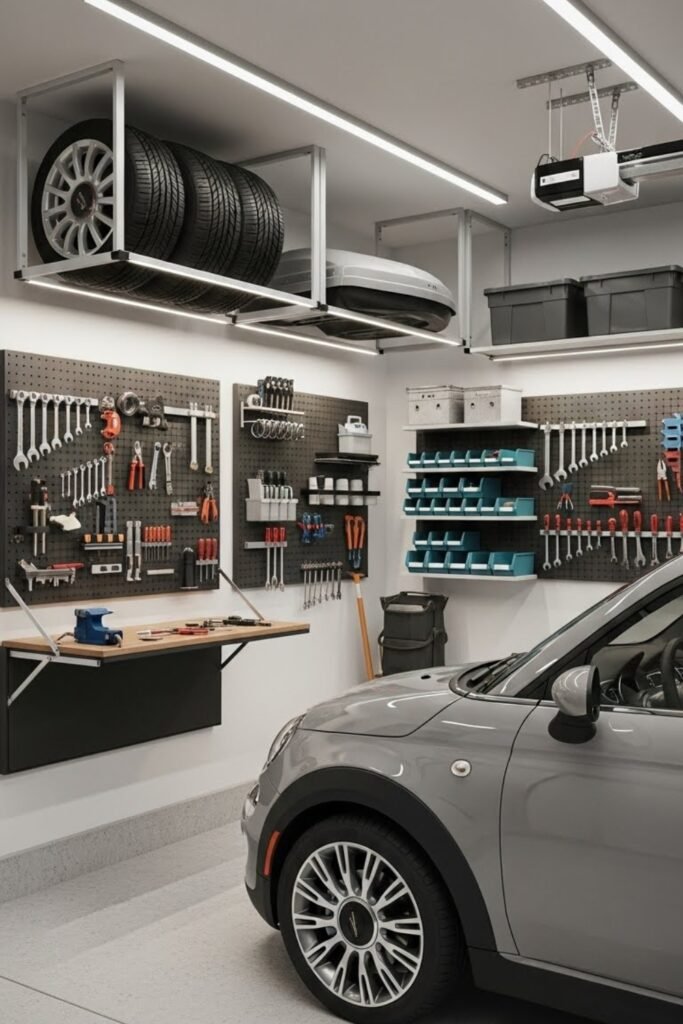 Designed for small garages, this layout focuses on maximizing every inch of space. Vertical shelving, wall-mounted racks, and fold-down work surfaces keep the floor open for parking.