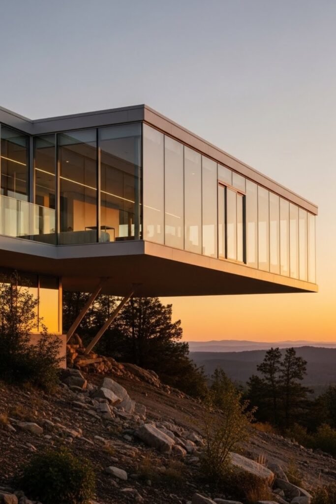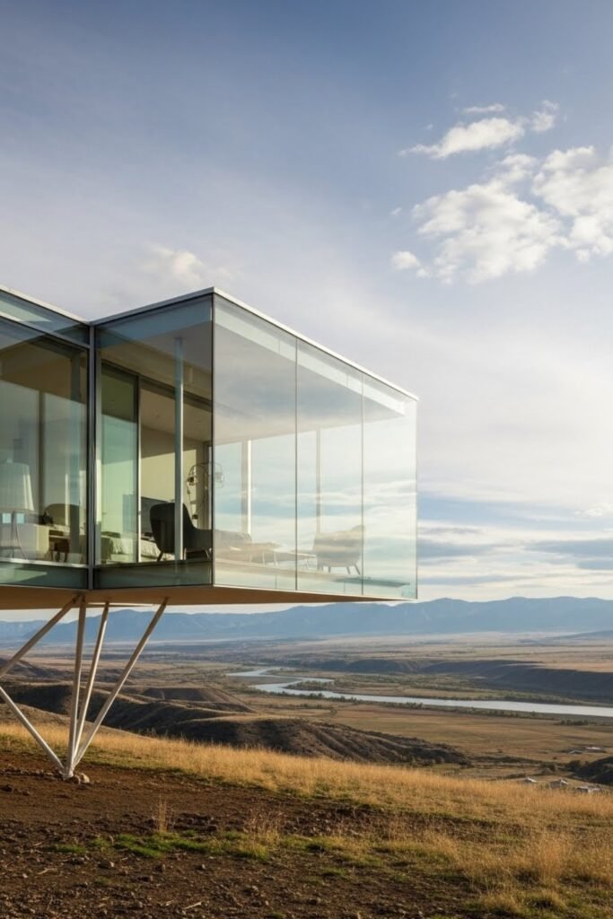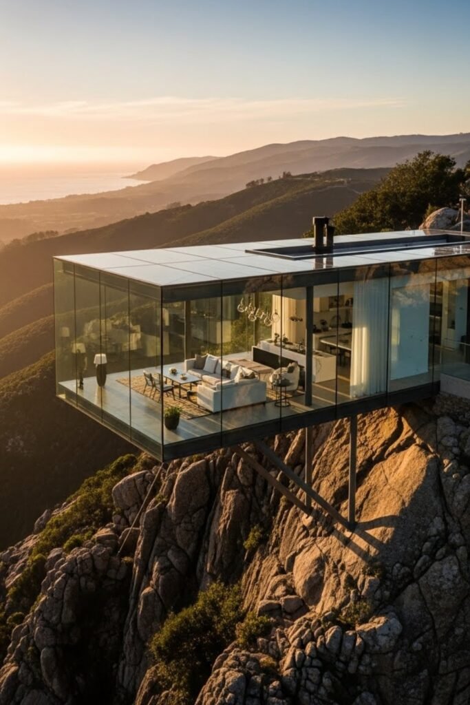 A cliffside glass house extends toward open landscapes to maximize dramatic views. Large glass panels frame mountains, valleys, or ocean scenery without blocking light. Structural supports are kept minimal to enhance the floating effect.