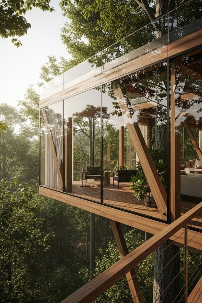 This glass house balances openness with comfort by using exterior privacy screens. Wooden slats, metal panels, or vertical greenery soften the transparency without blocking light.