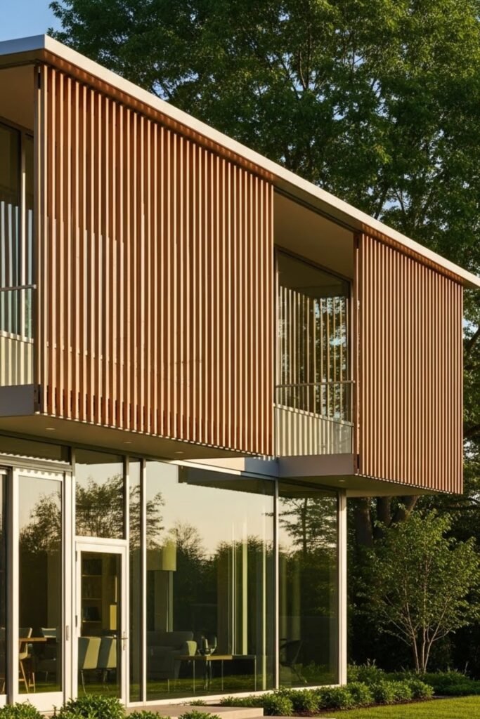 The screens help control views, reduce glare, and add texture to the design. This idea works well in neighborhoods where full glass walls need thoughtful privacy solutions.