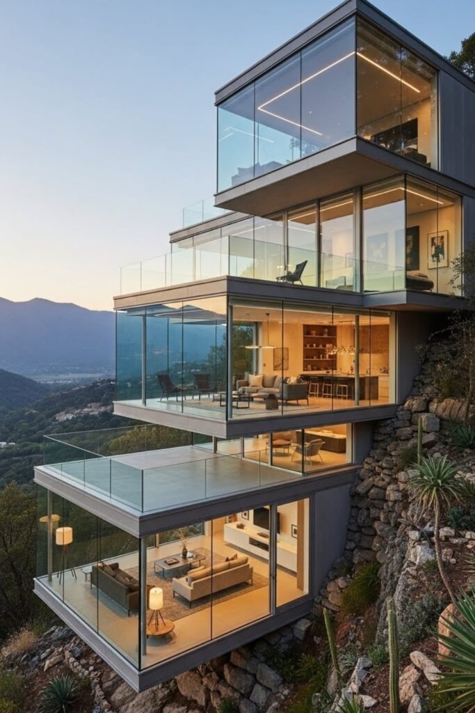 This glass house combines a solid stone foundation with lighter glass upper levels. The stone base provides stability, privacy, and insulation, while the glass structure above keeps the home open and modern.