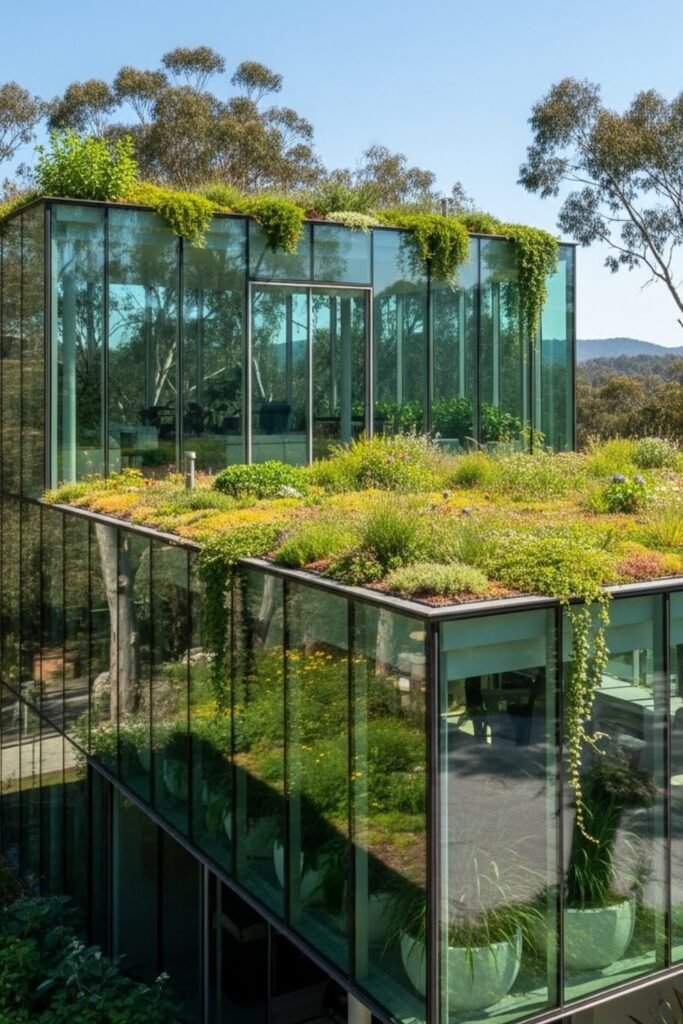 This glass house pairs transparent walls with a planted rooftop. The green roof improves insulation, manages rainwater, and blends the home into its surroundings.