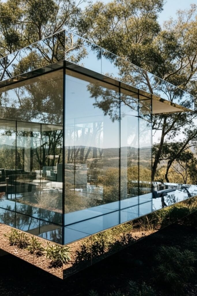 This glass house uses reflective glass panels that mirror the surrounding landscape. During the day, the exterior blends into nature, reducing visual impact and improving privacy.